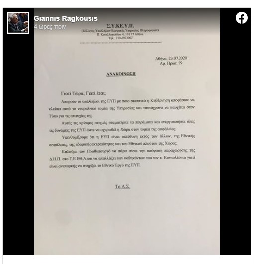 Ο τομεάρχης Προστασίας του Πολίτη του ΣΥΡΙΖΑ, Γιάννης Ραγκούσης μέσω ανάρτησής του στο facebook έκανε γνωστή την ανακοίνωση του συλλόγου υπαλλήλων της ΕΥΠ προς τον Πρωθυπουργό, με την οποία ζητείται να αποπεμφθεί ο διοικητής της Υπηρεσίας, Παναγιώτης Κοντολέων λόγω «ανεπάρκειας».