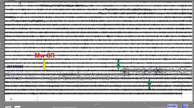 Ο σεισμός καταγράφηκε έπειτα από 25 λεπτά από τον σεισμογράφο που λειτουργεί στο πλαίσιο του προγράμματος RACCE στο Μουσείο, ενώ οι καταγραφές των δονήσεων (πράσινα βέλη) διήρκεσαν για πάνω από 2 ώρες.
