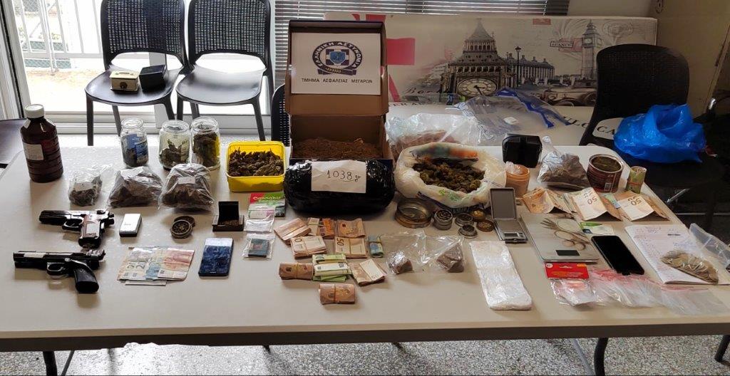 Οι αστυνομικοί του Τμήματος Ασφαλείας Μεγάρων συνέλαβαν τρία άτομα, ηλικίας 56, 65 και 34 ετών, και στην κατοχή τους βρήκαν ακατέργαστη κάνναβη (2.824 γραμμάρια), κατεργασμένη κάνναβη (126 γραμμάρια), σπόρους κάνναβης, τρίφτες κάνναβης, 4 ζυγαριές ακριβείας, πλήθος πλαστικών συσκευασιών για επιμερισμό ναρκωτικών, το χρηματικό ποσό των 14.840 ευρώ και 2 αεροβόλα πιστόλια.
