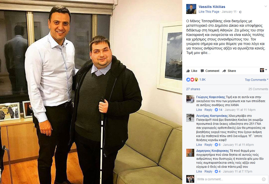Ο λόγος για τον Χανιώτη νομικό, Μάνο Τσιτσιριδάκη, για τον οποίο ο Εκπρόσωπος Τύπου της ΝΔ έγραψε στον προσωπικό του λογαριασμό στο facebook: «Ο 27χρονος Χανιώτης νομικός Μάνος Τσιτσιριδάκης είναι άτομο με πρόβλημα όρασης.