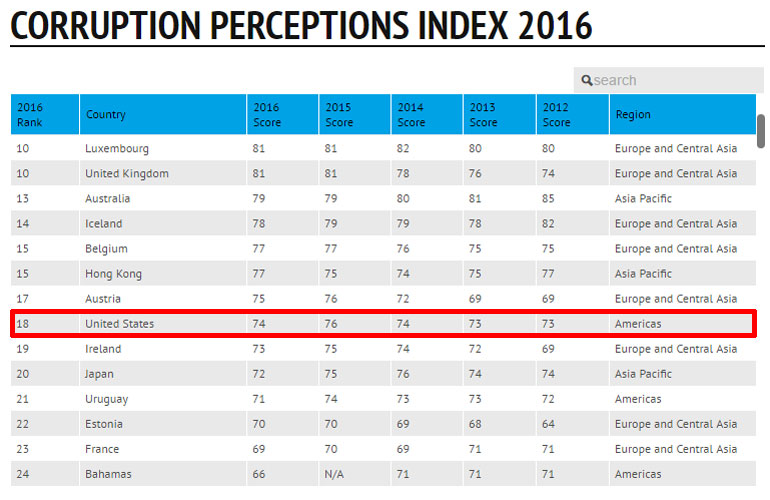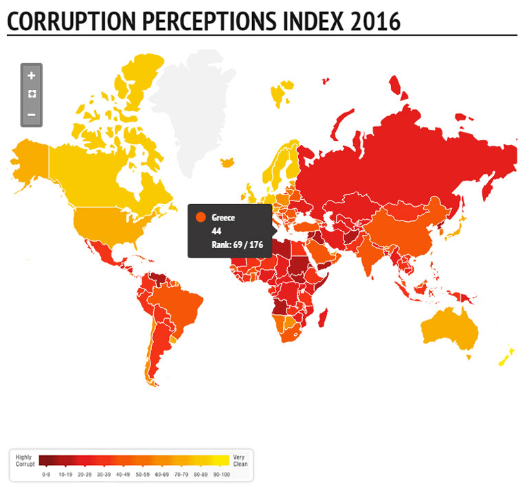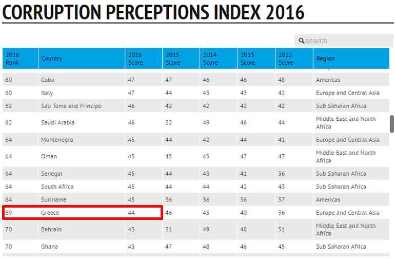 Η Ελλάδα από την 58η θέση στην οποία βρισκόταν το 2015 υποχώρησε στην 69η θέση, επιστρέφοντας στα επίπεδα του 2014 και ακολουθώντας την παγκόσμια τάση που καταγράφει αύξηση της διαφθοράς Έντεκα θέσεις έχασε η Ελλάδα στην κατάταξη των χωρών με τη λιγότερη διαφθορά της «Διεθνούς Διαφάνειας».