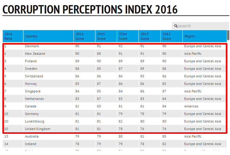 Τα «σκήπτρα» της πλέον αδιάφθορης χώρας κρατάει για τρίτη χρονιά η Δανία. Την πρώτη δεκάδα συμπληρώνουν οι Ν. Ζηλανδία, Φινλανδία, Σουηδία, Ελβετία, Νορβηγία, Σιγκαπούρη, Ολλανδία, Καναδάς, ενώ στη 10η θέση «συγκατοικούν» η Γερμανία, το Λουξεμβούργο και το Ηνωμένο Βασίλειο.