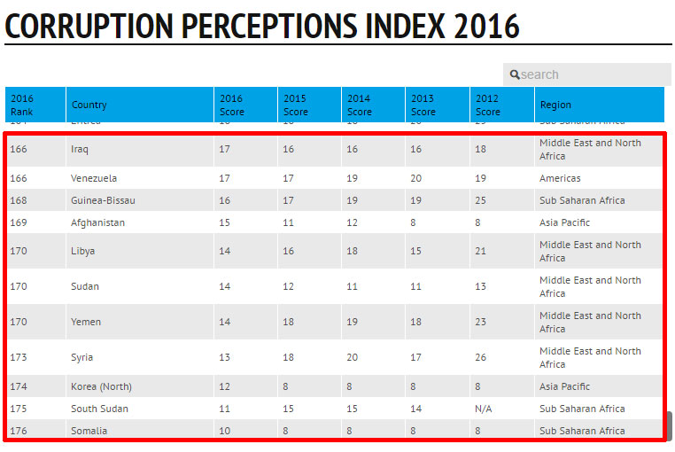 Στον αντίποδα, οι πλέον διεφθαρμένες χώρες είναι κατά σειράν οι Σομαλία, Ν. Σουδάν, Ν. Κορέα, Συρία, Υεμένη, Σουδάν, Λιβύη, Αφγανιστάν, Γουινέα-Μπισάου, Βενεζουέλα, Ιράκ, Ερυθραία και Ανγκόλα.