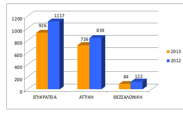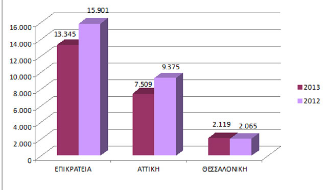 Συγκεκριμένα, σε επίπεδο Επικράτειας, καθώς και στις πόλεις της Αθήνας και της Θεσσαλονίκης, όπου παρατηρείται ο κύριος όγκος των ληστειών, στη σύγκριση του πρώτου διμήνου του 2013 με το 2012, καταγράφονται: