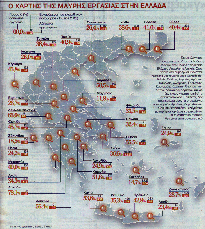 Σύμφωνα με τους ελέγχους του Σώματος Επιθεώρησης Εργασίας (ΣΕΠΕ) και της Ειδικής Υπηρεσίας Ελέγχου Ασφάλισης (ΕΥΠΕΑ), το ποσοστό των ανασφάλιστων εργαζομένων, σε όλη τη χώρα, στο επτάμηνο Ιανουαρίου – Ιουλίου 2012, έχει αυξηθεί σε 35,4% από 29,1% το αντίστοιχο διάστημα του 2011.