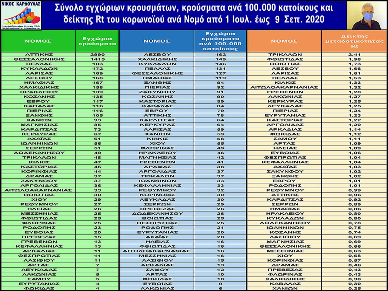 Συγκεκριμένα αποτυπώνονται σε πίνακες το σύνολο των εγχώριων κρουσμάτων, τα εγχώρια κρούσματα ανά 100.000 κατοίκους και ο δείκτης μεταδοτικότητας Rt, ανά Περιφέρεια και Νομό της χώρας μας, στο παραπάνω χρονικό διάστημα.