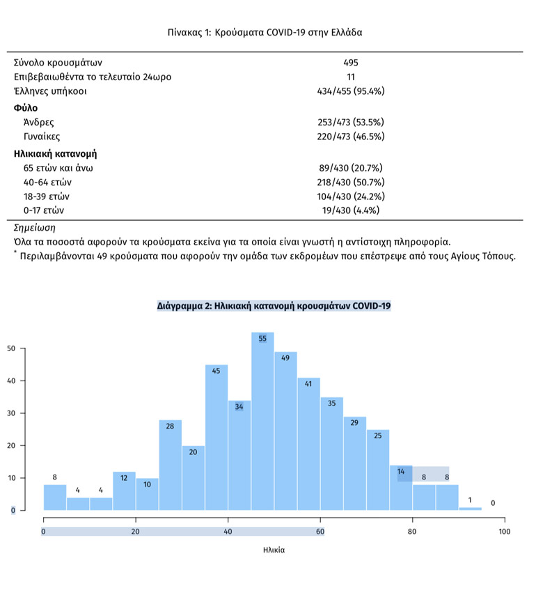 Από το σύνολο των επιβεβαιωμένων κρουσμάτων στην Ελλάδα το 95.4 % αφορά Έλληνες (455 στο σύνολο ) και άλλοι 40 θετικοί στον κορωνοϊό είναι αλλοδαποί που ζουν στην Ελλάδα.