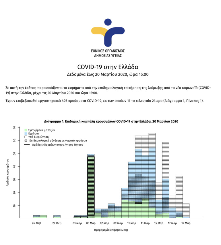 Στην πρώτη επιδημιολογική έκθεση που δημοσιεύθηκε (και συνοδεύεται από ενδιαφέροντα) γραφήματα στην επίσημη ιστοσελίδα Εθνικού Οργανισμού Δημόσιας Υγείας, φαίνεται το 23,6% δηλαδή 117 έχουν ή εξακολουθούν να νοσηλεύονται σε νοσοκομείο από τους οποίους 26 χρειάσθηκε να μπουν στον αναπνευστήρα και να διασωληνωθουν.