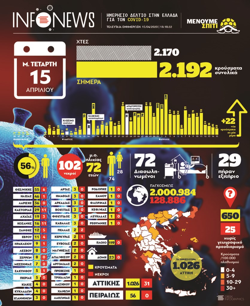 Δείτε στο infographic που ακολουθεί τον ελληνικό χάρτη των κρουσμάτων του κορωνοϊού, καθώς και τα υπόλοιπα στοιχεία: