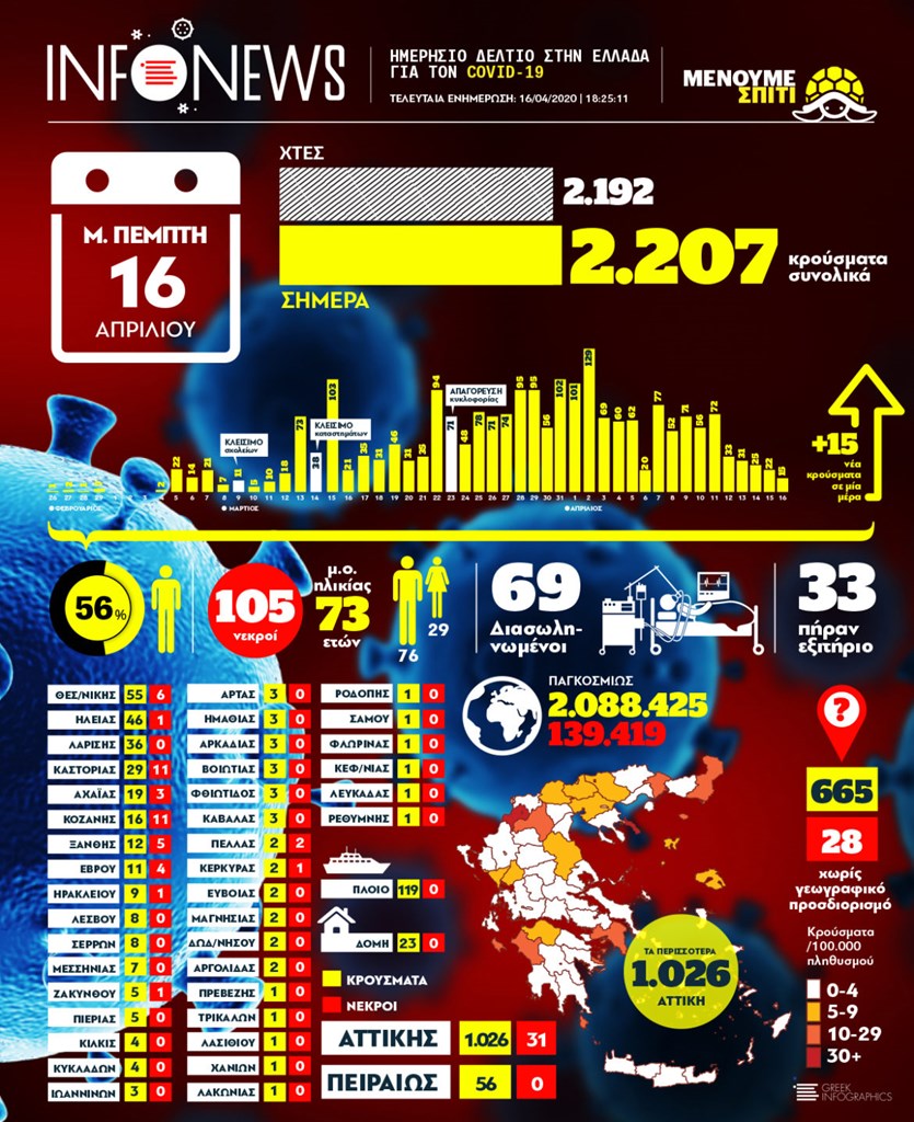 Δείτε στο infographic που ακολουθεί τον χάρτη των κρουσμάτων του κορωνοϊού στην Ελλάδα, καθώς και τα υπόλοιπα στοιχεία σχετικά με την πορεία της πανδημίας στη χώρα μας: