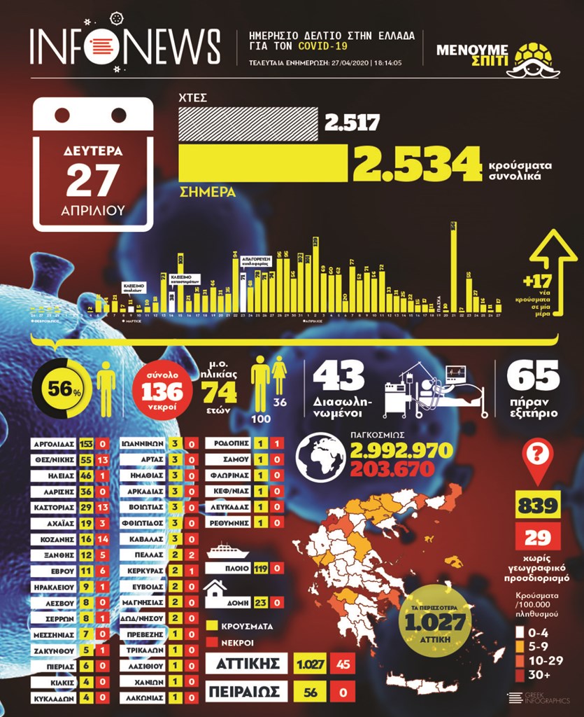 Δείτε στο Infographic που ακολουθεί τον ελληνικό «χάρτη» του κορωνοϊού, με τα στοιχεία της πορείας της πανδημίας στη χώρα μας, όπως διαμορφώνονται μετά τη σημερινή ενημέρωση του υπουργείου Υγείας: