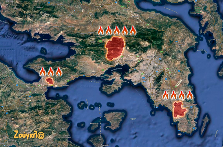 Ο χάρτης των πυρκαγιών σε Μάνδρα, Λουτράκι και Σαρωνίδα