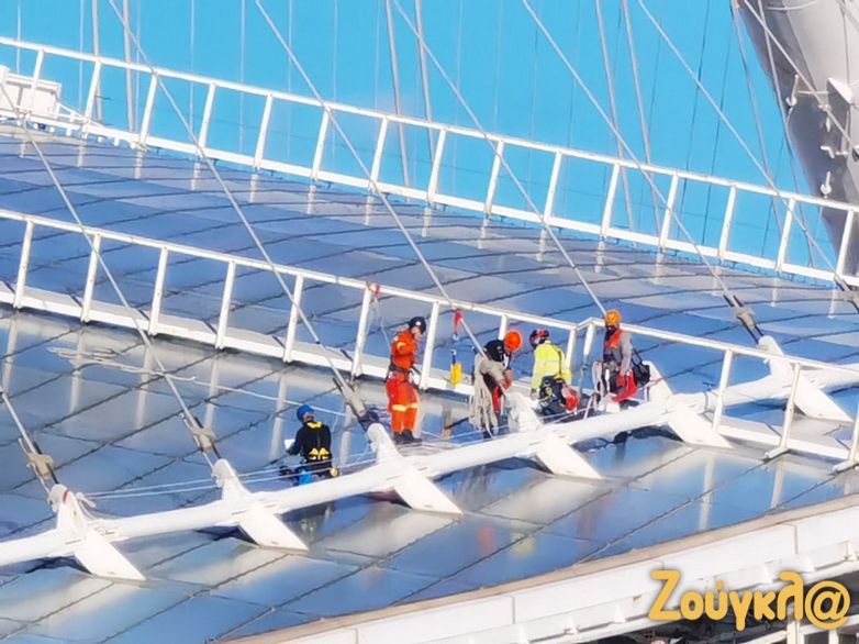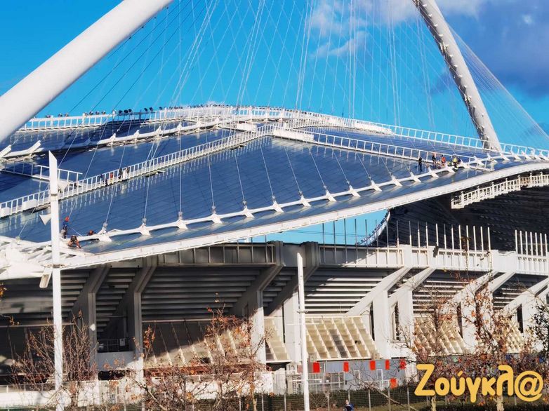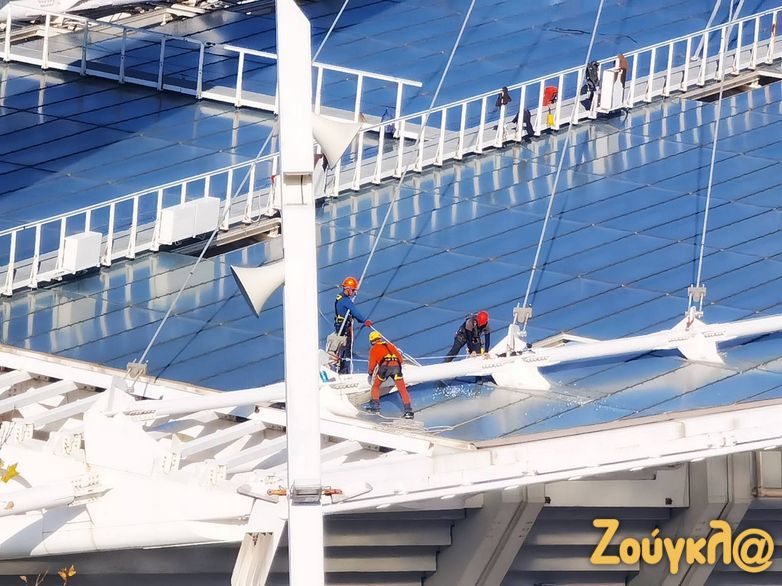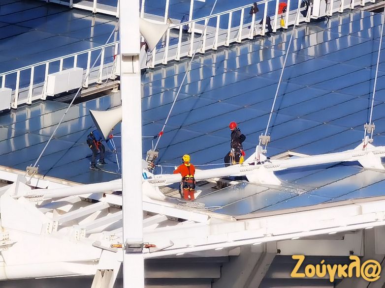 Για ακόμα μια μέρα συνεχίζονται οι εργασίες στο στέγαστρο Καλατράβα του ΟΑΚΑ. Κλιμάκιο συντηρητών, που φέρει ειδικό εξοπλισμό, έχει αρχίσει να ξηλώνει τα πάνελ από το στέγαστρο, καθώς κρίθηκε ότι πρέπει να αντικατασταθούν λόγω φθοράς.
