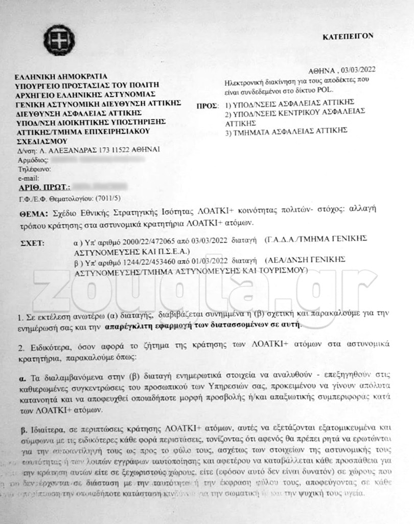 Η διαταγή με την ένδειξη «κατεπείγον», την οποία παρουσιάζει η zougla.gr, περιγράφει ποιες πρέπει να είναι οι κινήσεις αστυνομικών σε περίπτωση που κάποιο άτομο ανήκει στην συγκεκριμένη κατηγορία. Μάλιστα, δίνονται εντολές προκειμένου «να γίνουν απόλυτα κατανοητά και να αποφευχθεί οποιαδήποτε μορφή προσβολής ή και απαξιωτικής συμπεριφοράς κατά των ΛΟΑΤΚΙ ατόμων».