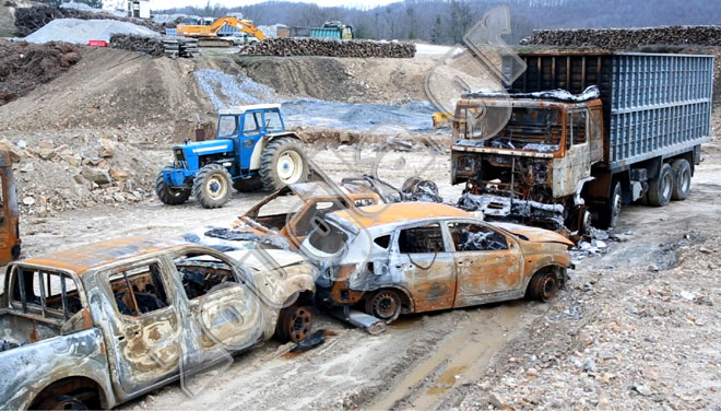 (Ακόμη παραμένουν στον χώρο του εργοταξίου τα καμένα οχήματα)