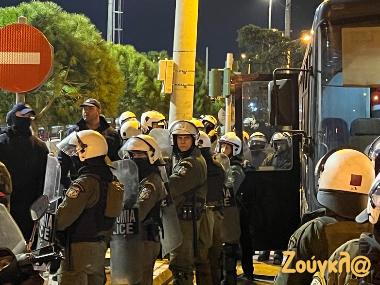 Όλοι τους έχουν μεταφερθεί στο Αλλοδαπών, στην Πέτρου Ράλλη, για να βρεθεί ο δράστης, που εκτόξευσε τη φωτοβολίδα, και τραυμάτισε σοβαρά τον νεαρό αστυνομικό στα μηριαία αγγεία.