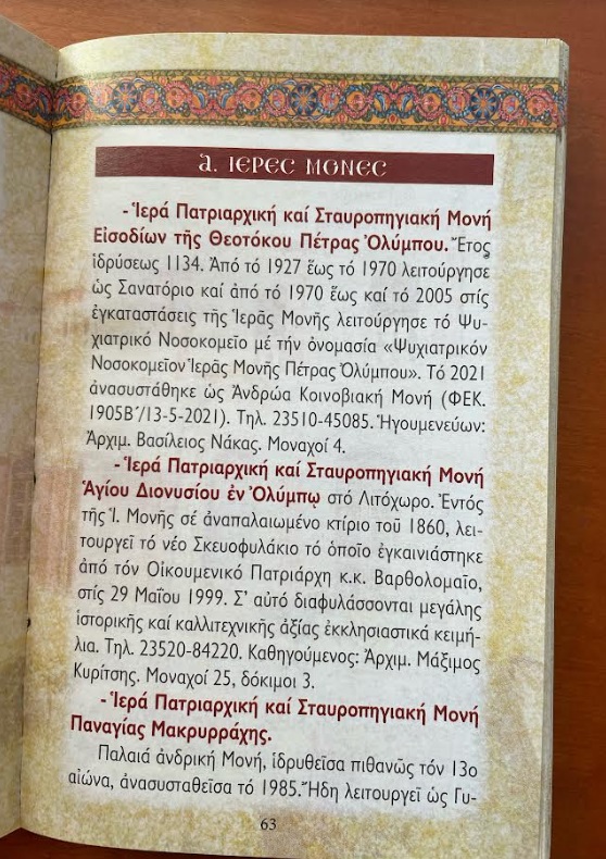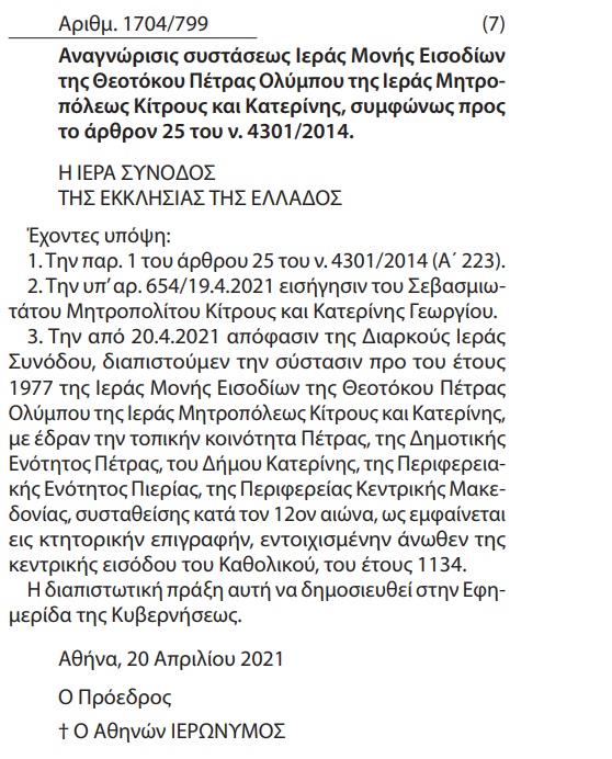 Στο Εγκόλπιον Ημερολογίου της Μητροπόλεως του 2023, στην αρχή, πριν από οποιαδήποτε άλλη δραστηριότητα ή αναφορά εμφανίζεται η ίδρυση (επανίδρυση της Μονής Πέτρας Ολύμπου, σύμφωνα με το Φύλλο της Κυβέρνησης αρ. 1905 Β του 2021). Όντως ερευνώντας με την βοήθεια της συγκεκριμένης ιστοσελίδας ανακαλύψαμε το σχετικό ΦΕΚ. Η αναφορά περί της Μονής είναι κρυμμένη σε έναν νόμο του Υπουργείου Αγροτικής Οικονομίας άρα προφανώς αποτέλεσε ειδική μεταμεσονύκτια τροπολογία, από αυτές που συνηθίζεται να παρεισφρέουν σε υπό συζήτηση νομοσχέδια αλλά ….στη ζούλα. Δείτε την επίσημη διατύπωση στο σχετικό ΦΕΚ «Αναγνώρισις συστάσεως Ιεράς Μονής Εισοδίων της Θεοτόκου Πέτρας Ολύμπου της Ιεράς Μητροπόλεως Κίτρους και Κατερίνης, συμφώνως προς το άρθρον 25 του ν. 4301/2014».
