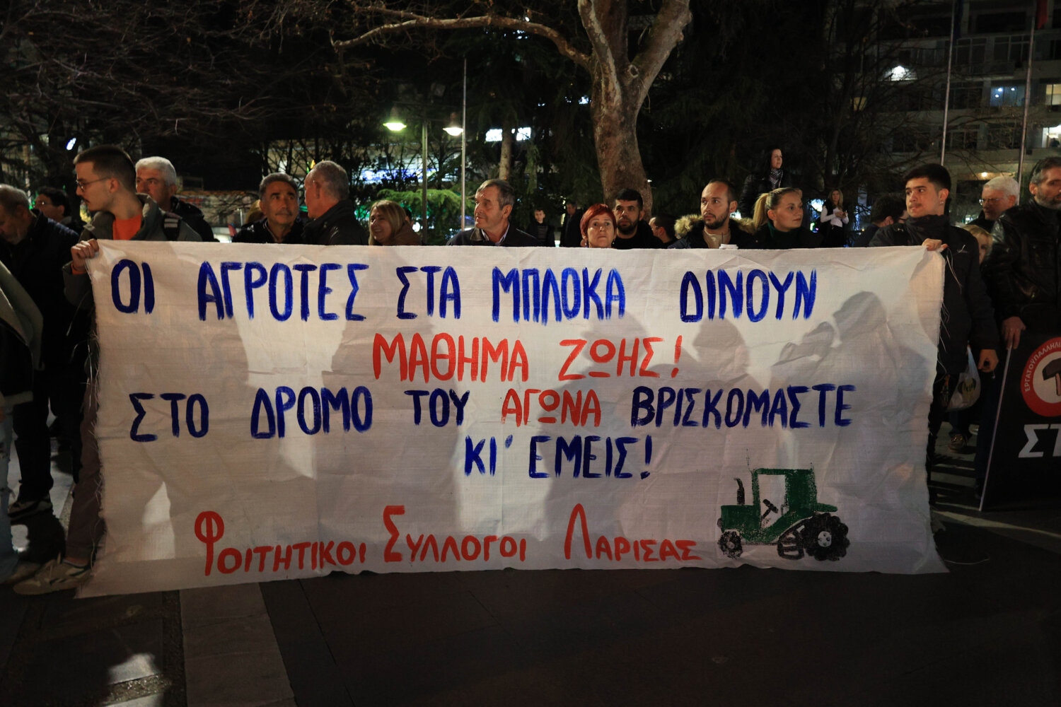 Εκεί τους υποδέχτηκαν το Εργατικό Κέντρο Λάρισας, σωματεία, φοιτητικοί σύλλογοι, φορείς, καθώς και η Ομοσπονδία Αγροτικών Συλλόγων Ν. Λάρισας, εκφράζοντας την αλληλεγγύη και την συμπαράσταση στον δίκαιο αγώνα και τα αιτήματα επιβίωσης των βιοπαλαιστών αγροτών και κτηνοτρόφων.