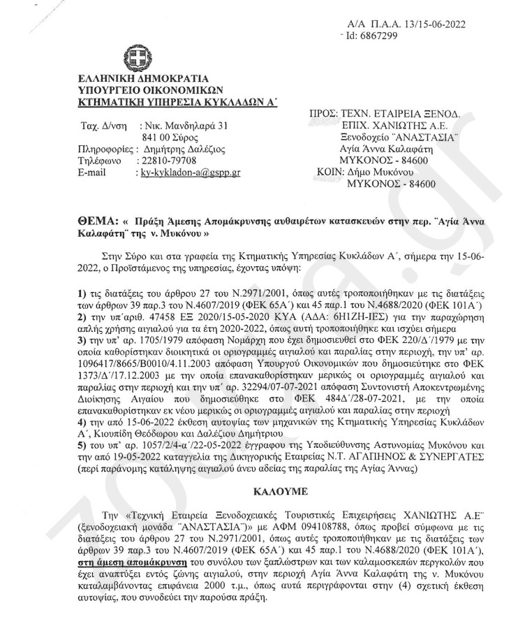 Πρόκειται για Πρωτόκολλο Καθορισμού Αυθαίρετης Χρήσης Αιγιαλού που έχει εκδοθεί από την Κτηματική Υπηρεσία Κυκλάδων Α για την παραλία της Αγίας Άννας. Συγκεκριμένα πρόκειται για το υπ’ αριθμ. 1/23-06-2023 Πρωτόκολλο Καθορισμού Αποζημίωσης Αυθαίρετης Χρήσης Αιγιαλού και Παραλίας με το οποίο επιβάλλεται στην εταιρεία ΧΑΝΙΩΤΗΣ ΑΕ συνολικό πρόστιμο για την αυθαίρετη χρήση του αιγιαλού για τα έτη 2018-2022 ποσού 236.500 ευρώ.