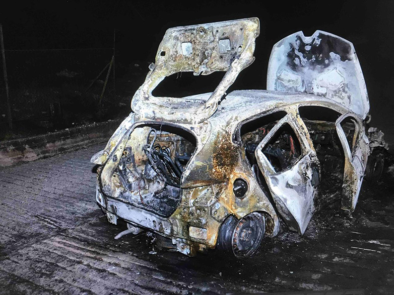 Στην εικόνα βλέπουμε το αυτοκίνητο που χρησιμοποίησαν τότε οι δράστες προκειμένου να διαφύγουν, καμένο από τους ίδιους ώστε να εξαφανίσουν τότε τα ίχνη τους.