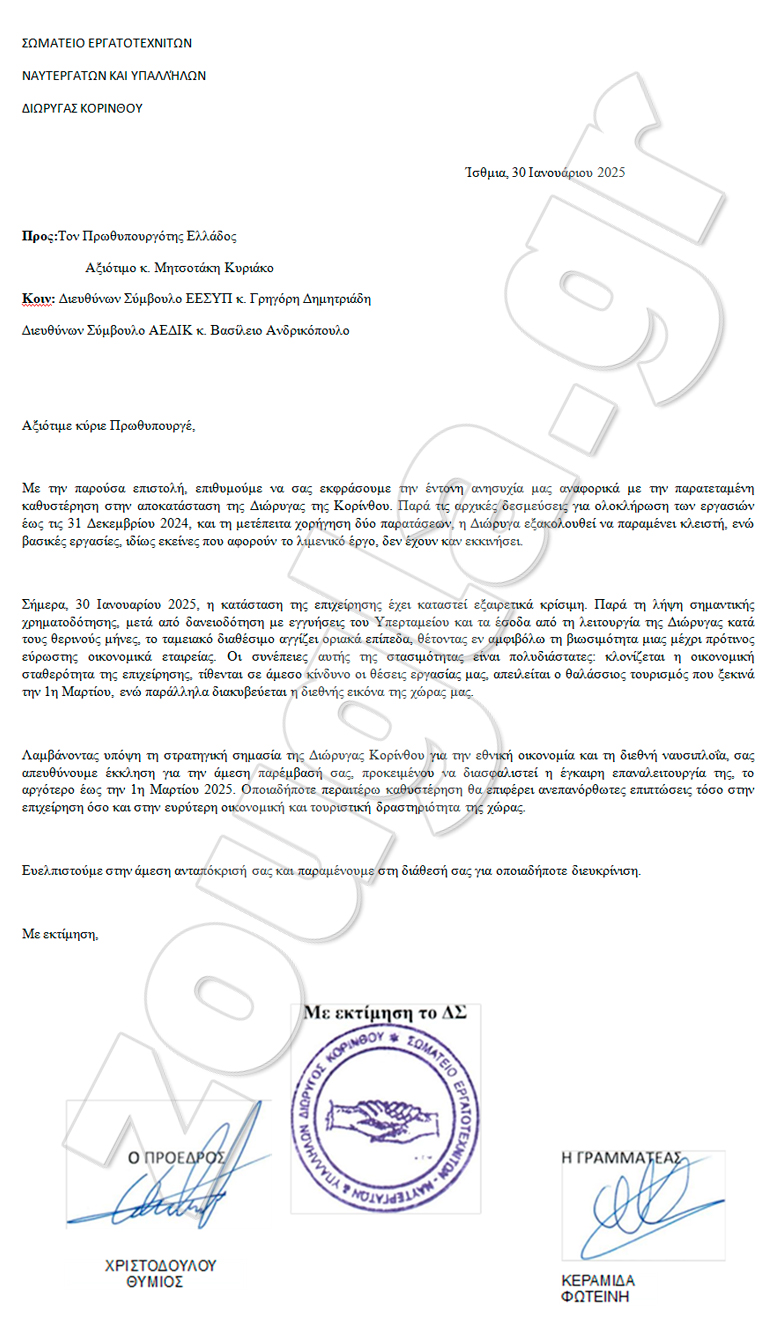 Λαμβάνοντας υπόψη τη στρατηγική σημασία της Διώρυγας Κορίνθου για την εθνική οικονομία και τη διεθνή ναυσιπλοΐα, σας απευθύνουμε έκκληση για την άμεση παρέμβασή σας, προκειμένου να διασφαλιστεί η έγκαιρη επαναλειτουργία της, το αργότερο έως την 1η Μαρτίου 2025. Οποιαδήποτε περαιτέρω καθυστέρηση θα επιφέρει ανεπανόρθωτες επιπτώσεις τόσο στην επιχείρηση όσο και στην ευρύτερη οικονομική και τουριστική δραστηριότητα της χώρας.