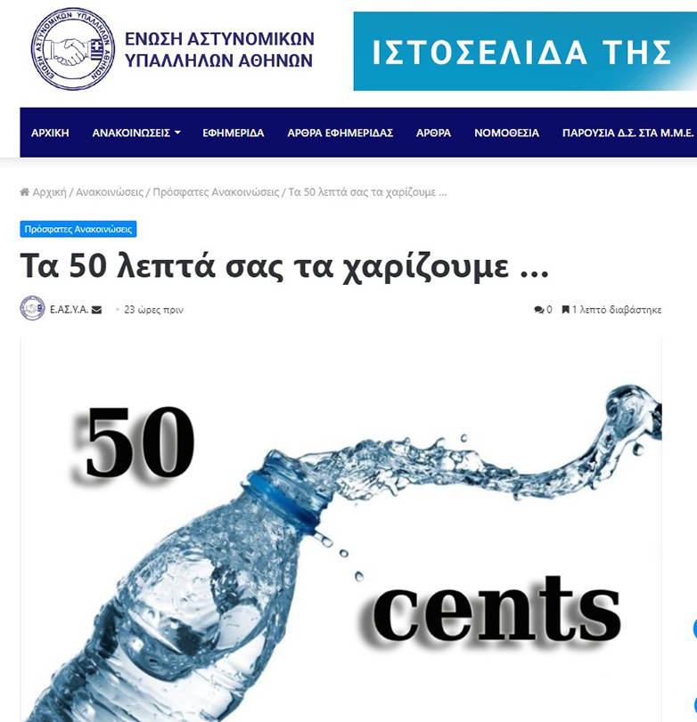 Με φωτογραφία ένα μπουκαλάκι νερού που παραπέμπει στα 50 λεπτά που θα πάρουν αύξηση, αναφέρει χαρακτηριστικά: «Τα 50 λεπτά σας τα χαρίζουμε… Οι εξαγγελίες του πρωθυπουργού στην Δ.Ε.Θ. προκάλεσαν μόνο οργή και αγανάκτηση στο σύνολο του αστυνομικού προσωπικού, αφού κανείς δεν πίστευε στα αυτιά του όταν άκουσε ότι ανακοινώθηκε η αύξηση της νυχτερινής αποζημίωσης κατά 20%, τουτέστιν 50 λεπτά την ώρα!!! Είναι απαράδεκτο να μην αναγνωρίζεται εμπράκτως η προσφορά ενός κλάδου με τόσους νεκρούς, με τόσους τραυματίες και με αυτή την καθημερινή προσφορά που κρατάει όρθιο το κράτος και την κοινωνία. Ο αστυνομικός, κύριοι της Κυβέρνησης είναι ήρωας πολέμου εν καιρώ ειρήνης και οφείλετε να το αναγνωρίσετε, τόσο αυξάνοντας τις οικονομικές του απολαβές, όσο και θωρακίζοντάς τον θεσμικά. Το απαιτεί η κοινωνία, το απαιτούμε όλοι εμείς».