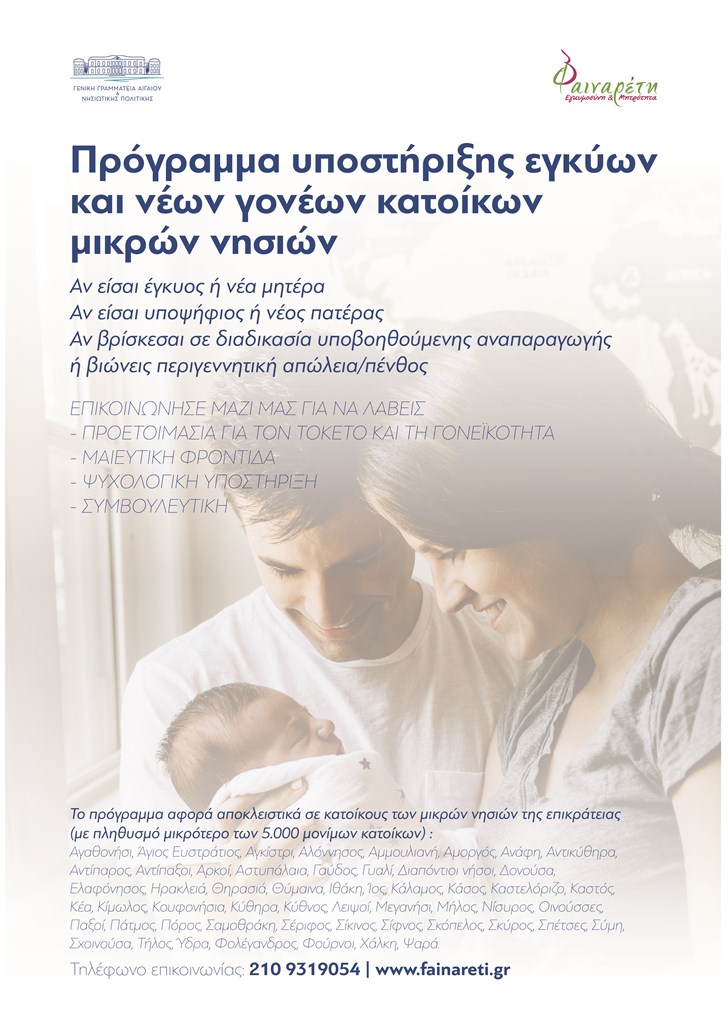 Το Πρόγραμμα Υποστήριξης Εγκύων και Νέων Γονέων Κατοίκων Μικρών Νησιών, το οποίο ξεκίνησε τον Οκτώβριο του 2022 με πρωτοβουλία της Γενικής Γραμματείας Αιγαίου και Νησιωτικής Πολιτικής και με φορέα υλοποίησης την ΑμΚΕ Φαιναρέτη, επεκτείνεται σε οκτώ (8) νέα νησιά μέχρι πέντε χιλιάδες (5.000) κατοίκους ήτοι: Αλόννησος, Αμμουλιανή, Κύθηρα, Μήλος, Πάτμος, Πόρος, Σκόπελος και Σπέτσες.