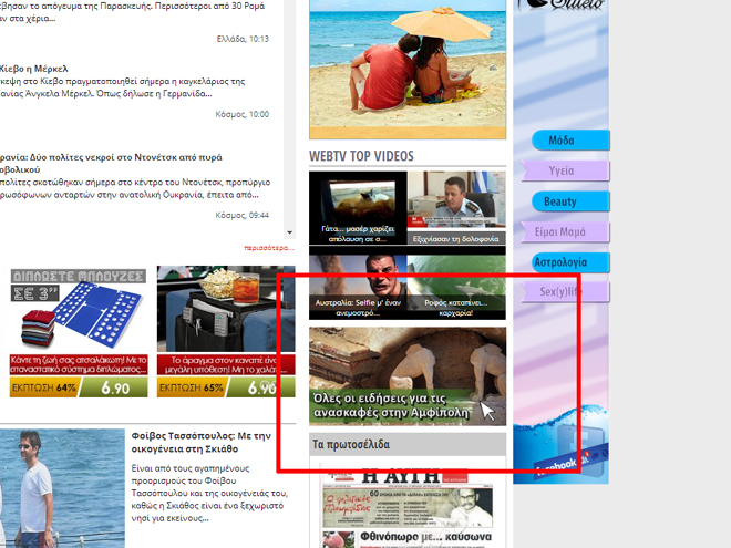 Στην αρχική σελίδα της ηλεκτρονικής μας εφημερίδας, εάν οδηγήσετε τον κέρσορα στη δεξιά πλευρά και στη συνέχεια προς τα κάτω, θα δείτε το ειδικό παράθυρο το οποίο παραπέμπει σε όλες τις ειδήσεις για τις ανασκαφές στην Αμφίπολη.