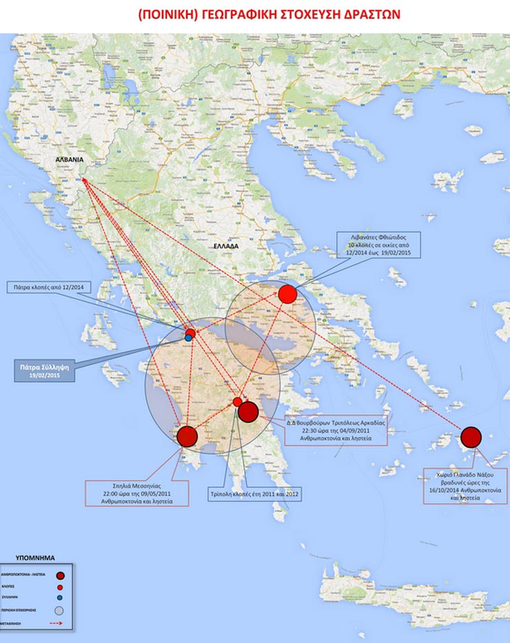 Από την έρευνα της Υπηρεσίας, προέκυψαν τα εξής: Ο πρώτος δράστης ταυτοποιήθηκε προανακριτικά με βάση πραγματολογικά αποδεικτικά δεδομένα και μεθοδολογικά στοιχεία ως υπαίτιος διάπραξης τριών ανθρωποκτονιών. Σε βάρος του εκδόθηκαν εντάλματα σύλληψης για ανθρωποκτονίες με πρόθεση και ληστείες, που τελέστηκαν στην Νάξο, στην Τρίπολη και στην Κυπαρισσία και αναζητείτο από τις Υπηρεσίες μας για να συλληφθεί.