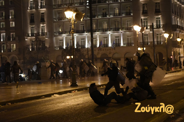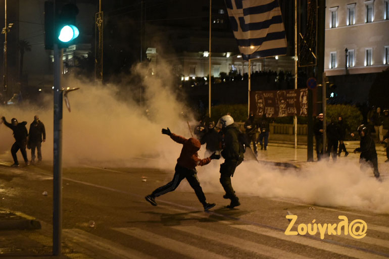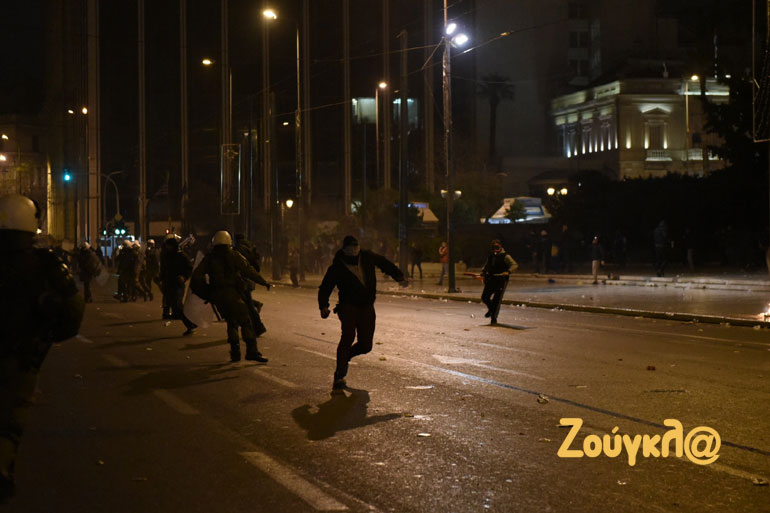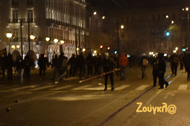 Λίγο μετά τις 22.00 το βράδυ, στην οδό Αμαλίας σημειώθηκε ένταση όταν κάποια άτομα πέταξαν πέτρες και έριξαν φωτοβολίδες προς τις αστυνομικές δυνάμεις, οι οποίες «απάντησαν» με περιορισμένη χρήση χημικών.