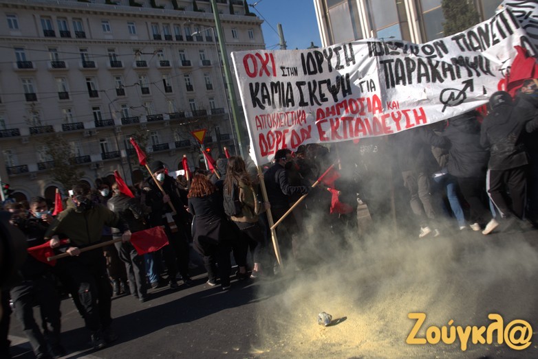 Οι διαδηλωτές, σύμφωνα με την ΕΛΑΣ, επιτέθηκαν με κοντάρια στους αστυνομικούς, που απάντησαν κάνοντας χρήση χημικών.