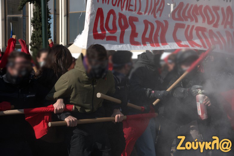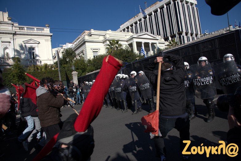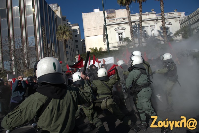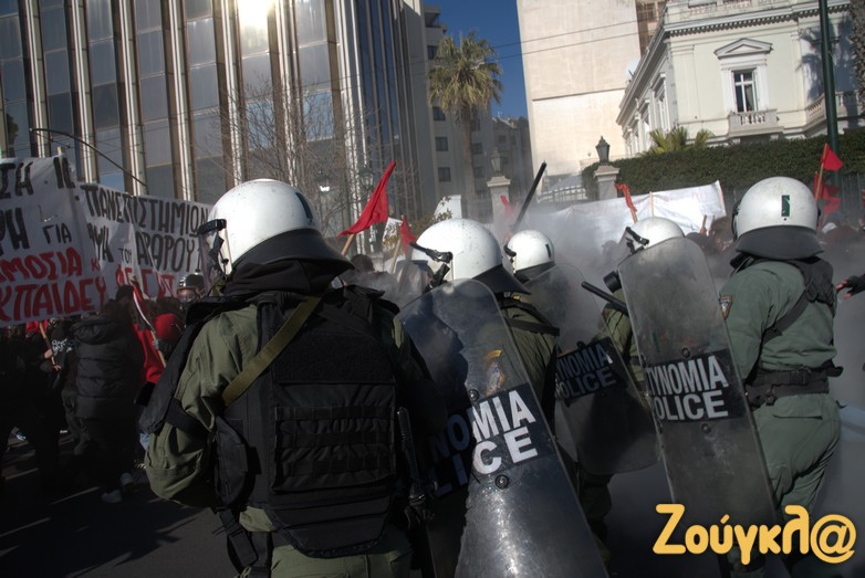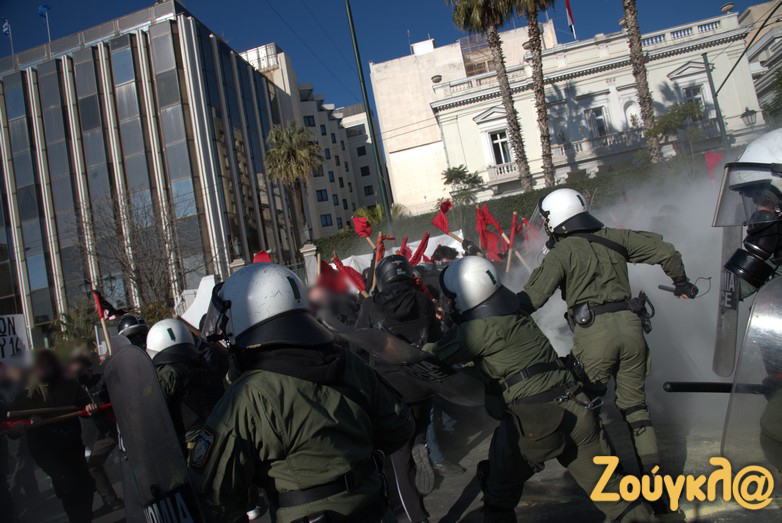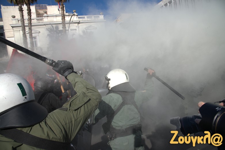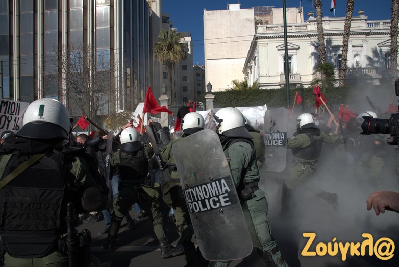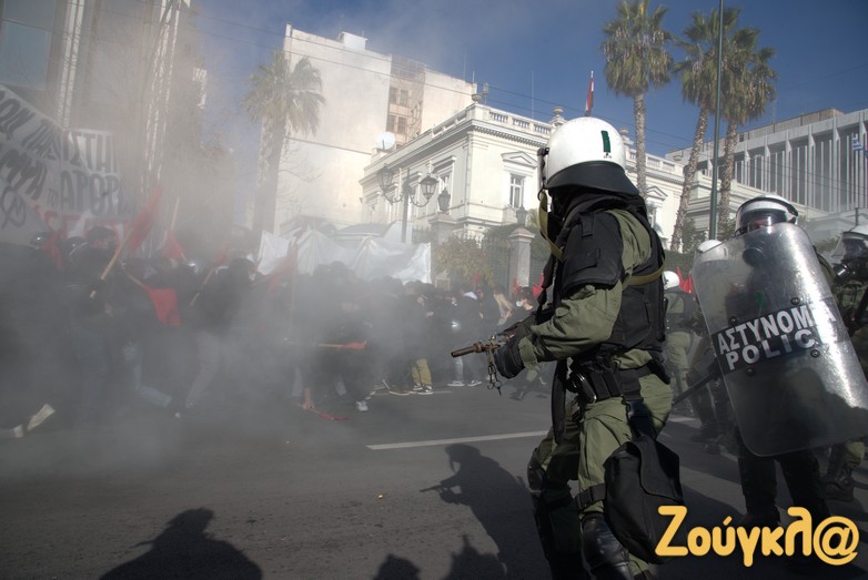 Οι διαδηλωτές, σύμφωνα με την ΕΛΑΣ, επιτέθηκαν με κοντάρια στους αστυνομικούς, που απάντησαν κάνοντας χρήση χημικών.