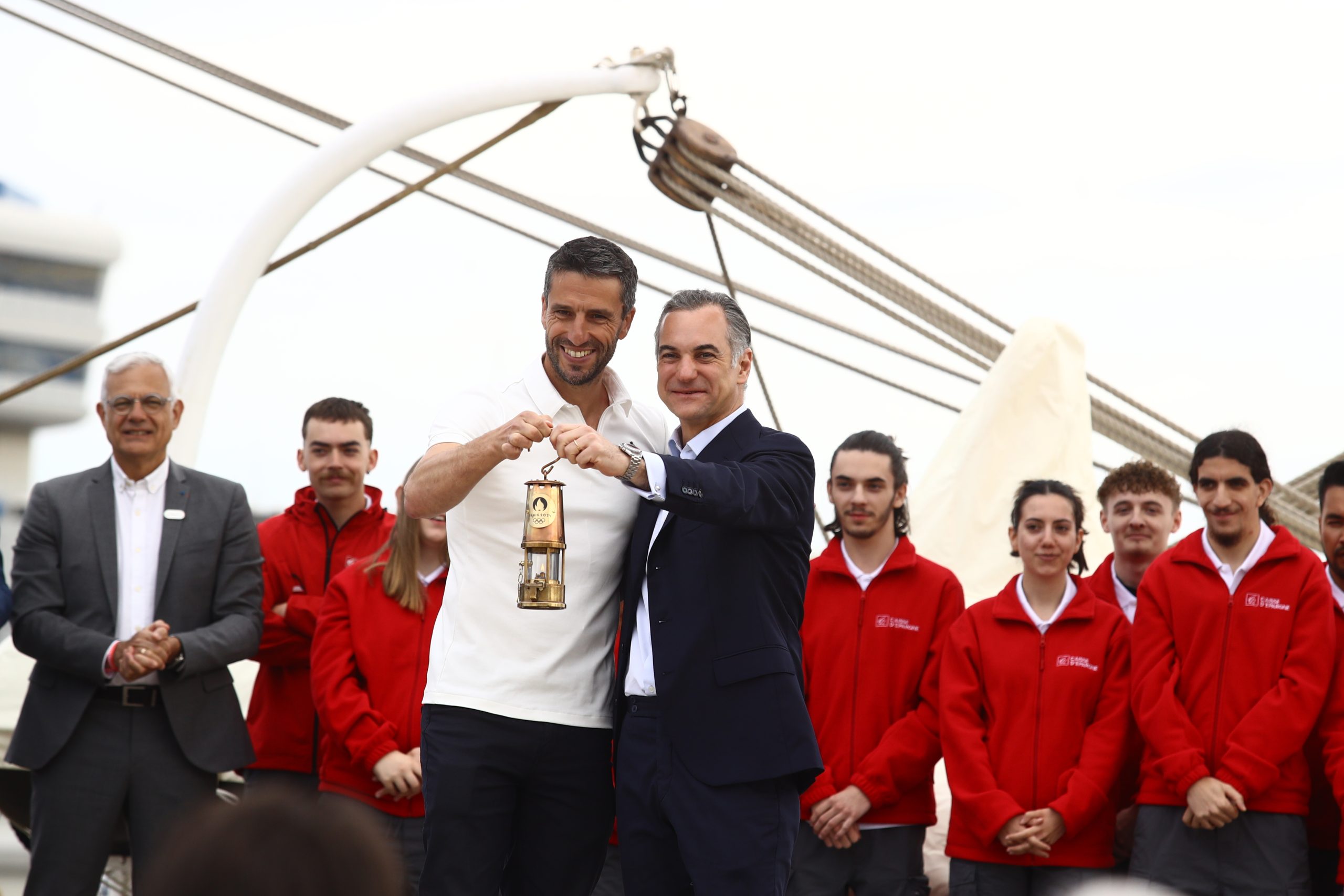 Ο Πρόεδρος της διοργανώτριας αρχής των Ολυμπιακών Αγώνων, Τόνι Εστανγκέ πρώην Ολυμπιονίκης στην Αθήνα στο κανόε καγιάκ, συγκινημένος, κράτησε στα χέρια του την Ολυμπιακή φλόγα, για να μεταφερθεί για πρώτη φορά στην ιστορία δια θαλάσσης στη Γαλλία, με το πανέμορφο ιστιοφόρο, σύμβολο της ναυτικής ιστορίας της χώρας.