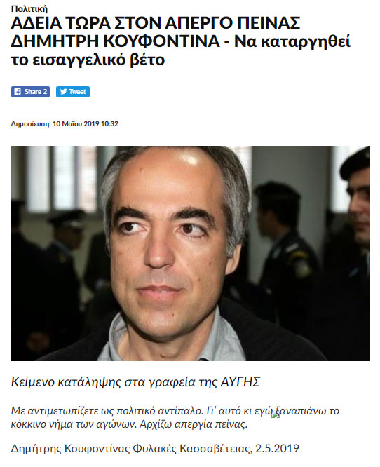 Ο Δ. Κουφοντίναςδεν είχε άλλη επιλογή από το να χρησιμοποιήσει το έσχατο μέσοπάλης που έχει ένας κρατούμενος: την απεργία πείνας. Αυτή η επιλογή ήταν μονόδρομος για έναν αγωνιστή με τα δικά του χαρακτηριστικά.