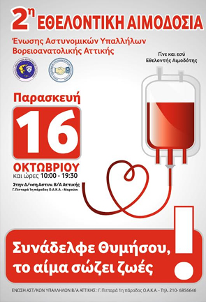 Την Παρασκευή 16/10/2015 και κατά τις ώρες 10:00 έως 19:30 στην έδρα της Δ/νσης Αστυνομίας Β/Α Αττικής (Γ. Πιτταρά 1η πάροδος Ο.Α.Κ.Α., Μαρούσι) θα πραγματοποιηθεί εθελοντική ομαδική αιμοδοσία με σκοπό την ενίσχυση της τράπεζας αίματος της Ένωσης Aστυνομικών Υπαλλήλων Βορειοανατολικής Αττικής.