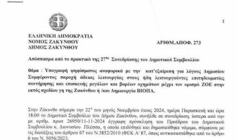 Το θέμα μάλιστα συζητήθηκε και στο Δημοτικό Συμβούλιο της Ζακύνθου, που όλως… τυχαίως αποφάσισε την έκδοση ψηφίσματος που φέρει την υπογραφή, μεταξύ άλλων, του δημάρχου, Γιώργου Στασινόπουλου, με θέμα «τον ορισμό ΖΟΕ στην εκτός σχεδίου γη της Ζακύνθου ή / και Δημιουργία ΒΙΟΠΑ και μέχρι τότε την κατ΄ εξαίρεση για λόγους Δημοσίου Συμφέροντος παροχή άδειας λειτουργίας στους ήδη λειτουργούντες επιτηδευματίες, ώστε να συνεχίσει να εξυπηρετείται η ανάγκη συντήρησης και επισκευής μεγάλων και βαρέων οχημάτων».