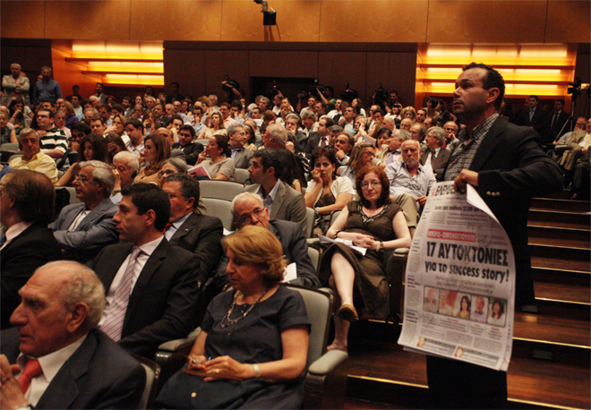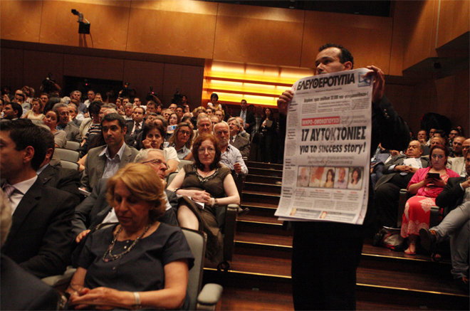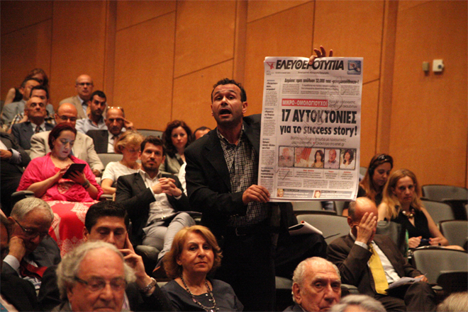 Αγανακτισμένοι ομολογιούχοι, που είδαν τις οικονομίες τους να εξατμίζονται με το κούρεμα του PSI, παρενέβησαν με φωνές και διαμαρτυρίες με αποτέλεσμα να διακοπεί για λίγο η εκδήλωση.