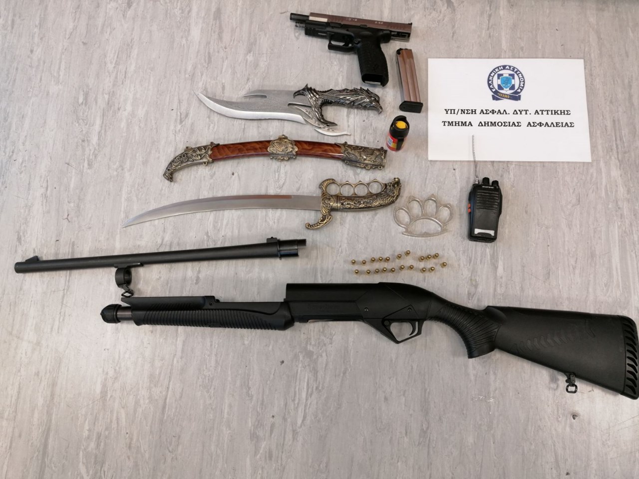 Σε έφοδο της Υποδιεύθυνσης Ασφάλειας Δυτικής Αττικής στις 9 Μαϊου, βρέθηκαν και κατασχέθηκαν πιστόλι, κυνηγετική καραμπίνα, είκοσι φυσίγγια, σπαθί, μαχαίρι, σιδερογροθιά, σπρέι πιπεριού και ασύρματος πομποδέκτης