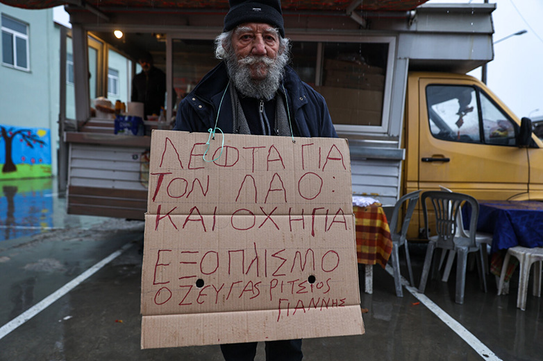 Ηλικιωμένος αγρότης έξω από το Πολιτιστικό Κέντρο Νίκαιας με χαρακτηριστικό αντιπολεμικό πλακάτ