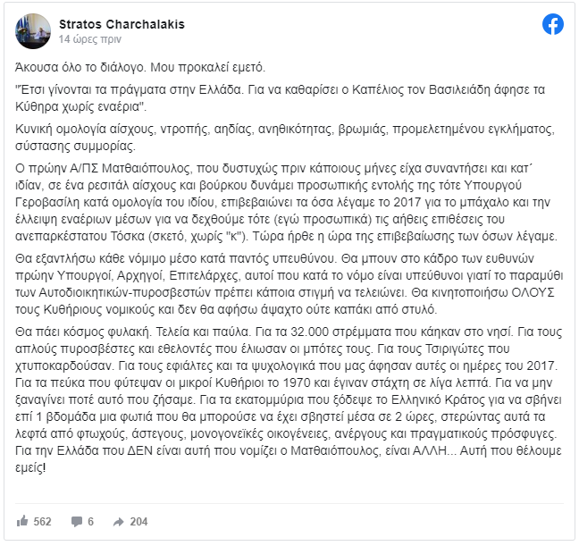 Μάλιστα, ο δήμαρχος Κυθήρων σε ανάρτησή του στο Facebook δηλώνει αποφασισμένος να αποδοθούν ευθύνες, κάνοντας λόγο για κυνική ομολογία αίσχους, ντροπής, αηδίας και ανηθικότητας.