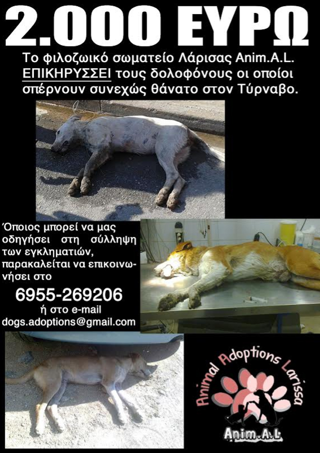 Μην ανέχεστε τους δολοφόνους δίπλα σας και μην περιμένετε να δηλητηριαστούν και τα παιδιά σας για να μιλήσετε! Επικηρύσσουμε τον/τους δολοφόνους με το ποσό των 2.000€ που θα δοθεί σε όποιον δώσει επώνυμα πληροφορίες που θα οδηγήσουν στην σύλληψη των δραστών. Όποιος γνωρίζει κάτι μπορεί να επικοινωνήσει στο email μας ή στο τηλέφωνο 6982461969.