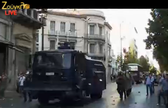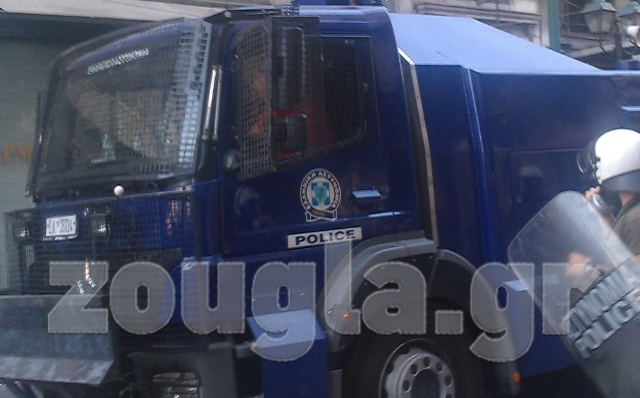 (Την εμφάνισή της έκανε και η “Αύρα”. Το υδροφόρο όχημα που απωθεί τους διαδηλωτές)