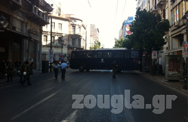 Δεκάδες κλούβες των ΜΑΤ απέκλεισαν τους δρόμους γύρω από την πλατεία Ομονοίας. Καθίσταται σαφές ότι δόθηκε η εντολή να μην επιτραπεί η πορεία προς την πρεσβεία.