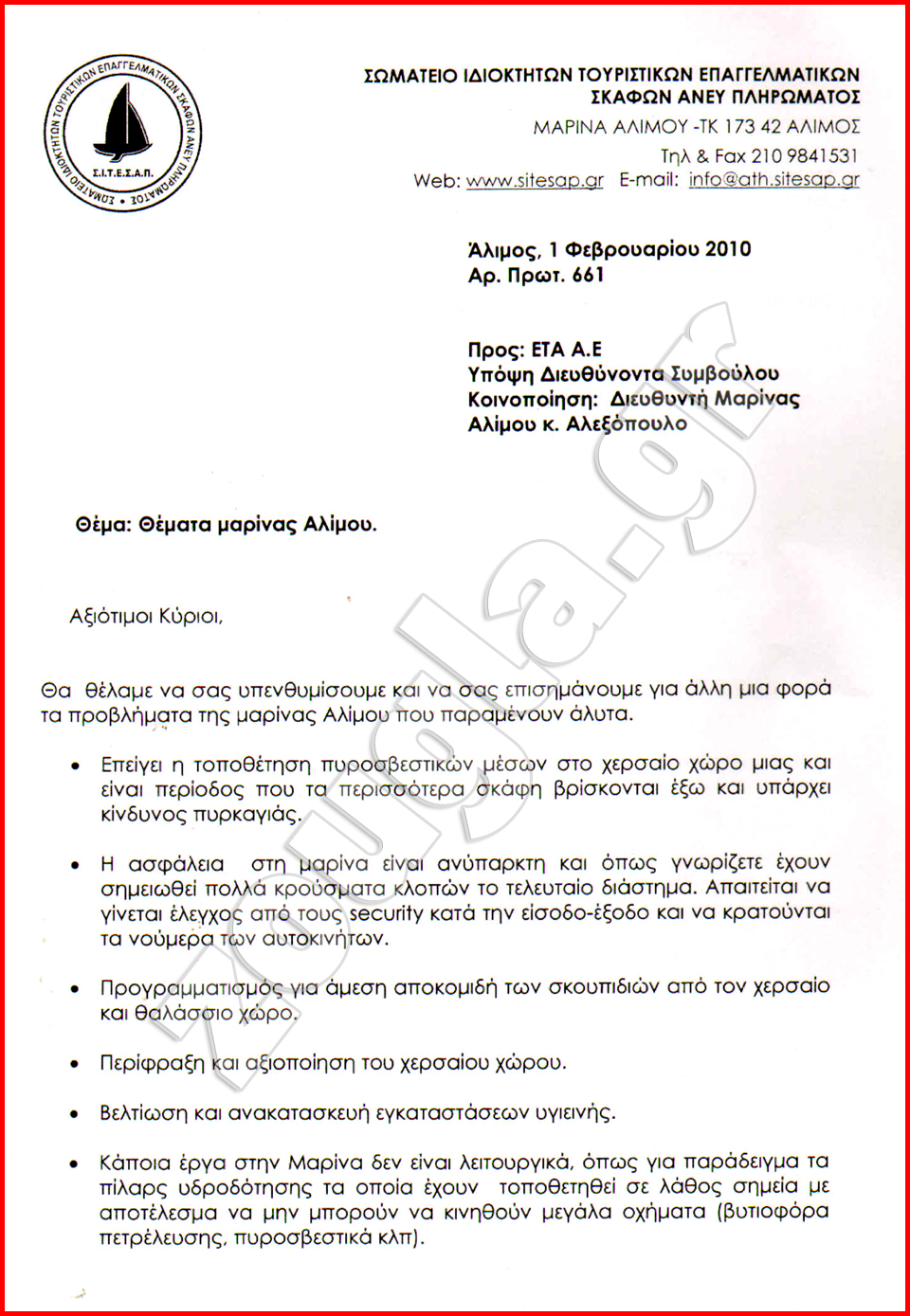 Τότε το Σ.Ι.Τ.Ε.Σ.Α.Π., το σωματείο το οποίο νοικιάζει σκάφη σε τουρίστες κατά τους θερινούς μήνες, έστειλε ένα εξώδικο προς τους αρμόδιους φορείς και ζητούσε την κατασκευή έργων, προκειμένου να βελτιωθούν οι, τριτοκοσμικές όπως τις χαρακτήριζε, υποδομές της μαρίνας.