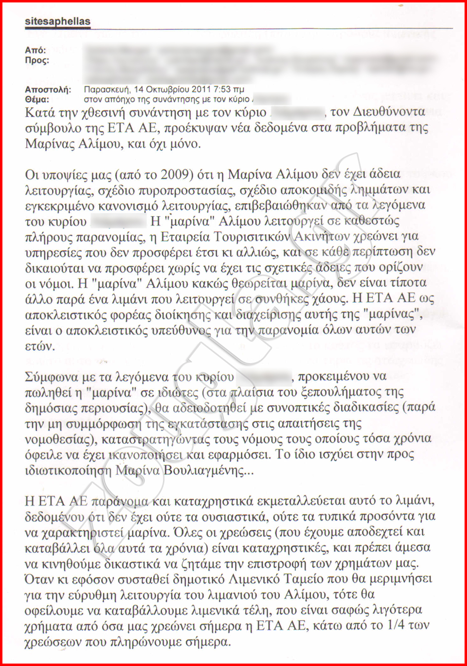 Άκρως αποκαλυπτικό είναι ένα e-mail με ημερομηνία αποστολής την 14η Οκτωβρίου 2011, μέλους του Σ.Ι.Τ.Ε.Σ.Α.Π.