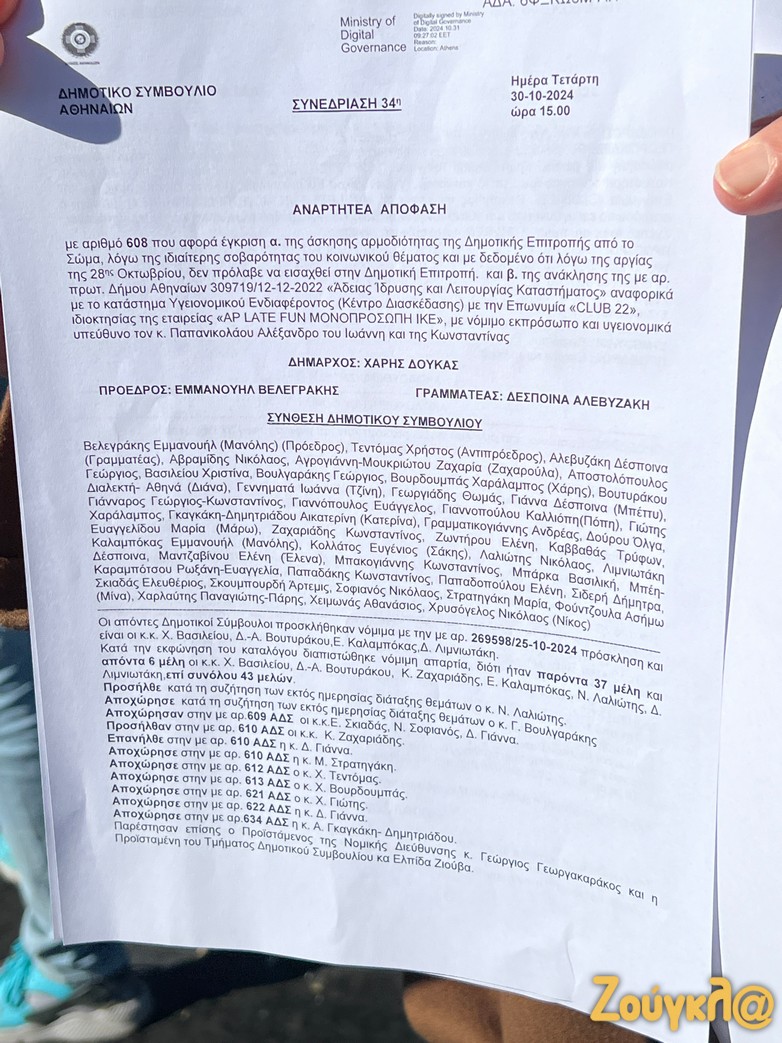 Παράλληλα με την σφράγιση της εξωτερικής θύρας του «Club 22», θυροκολλήθηκε και η σχετική απόφαση για το κλείσιμο του νυχτερινού κέντρου που λήφθηκε από το Δημοτικό Συμβούλιο της Αθήνας.