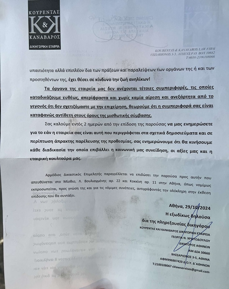 Το εξώδικο καταλήγει με νομική προθεσμία 2 ημερών για να δώσει εξηγήσεις η μισθώτρια εταιρεία. «Σε περίπτωση άπρακτης παρέλευσης της προθεσμίας – αναφέρει- σας ενημερώνουμε ότι θα κινήσουμε κάθε διαδικασία την οποία επιβάλει η κοινωνική μας συνείδηση, οι αξίες μας και η εταιρικής μας κουλτούρα».