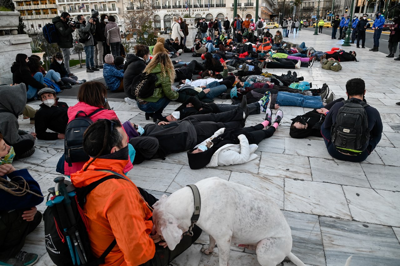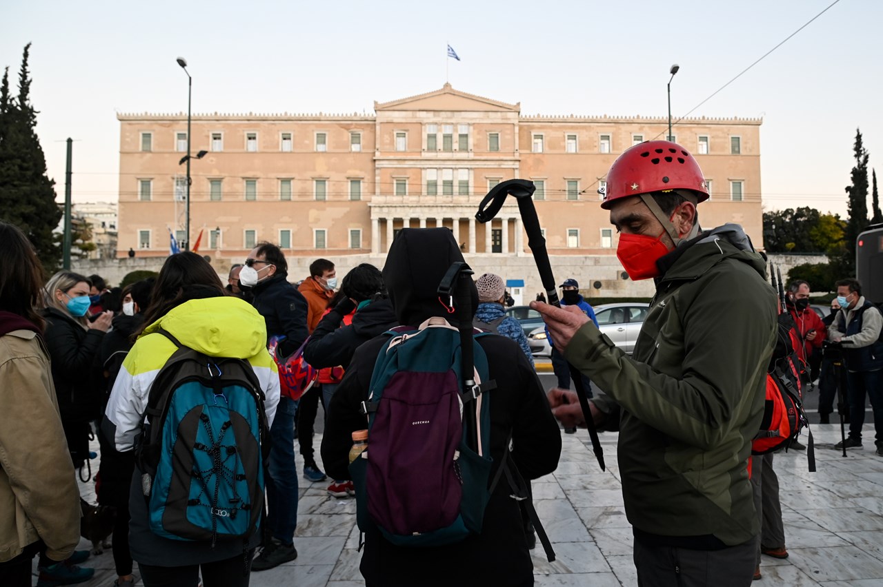 Οι συγκεντρωμένοι και οι συγκεντρωμένες κουβαλώντας τον ειδικό εξοπλισμό τους, όπως σκι, snowboards, μπατόν και πιολέ, σε ένδειξη διαμαρτυρίας ξάπλωσαν στην πλατεία Συντάγματος, αναπαριστώντας τους πολυτραυματίες θέλοντας, όπως είπαν, να στείλουν το δικό τους μήνυμα για μία «σοβαρή διαδικασία διάσωσης στα βουνά» με καταλληλότερα και εξειδικευμένα μέσα.