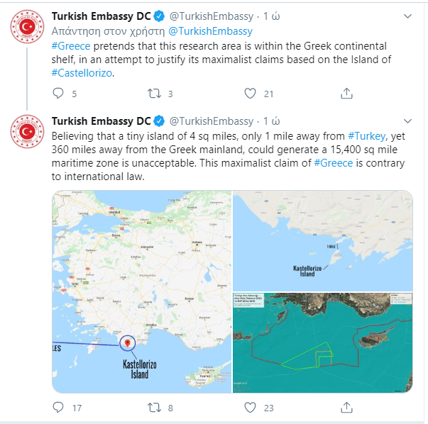 Παράλληλα, σε άλλη νεότερη ανάρτηση αναφέρει πως «η Ελλάδα προσποιείται ότι αυτή η ερευνητική περιοχή βρίσκεται εντός της ελληνικής ηπειρωτικής υφαλοκρηπίδας, σε μια προσπάθεια να δικαιολογήσει τους μαξιμαλιστικούς ισχυρισμούς της για το Καστελόριζο».