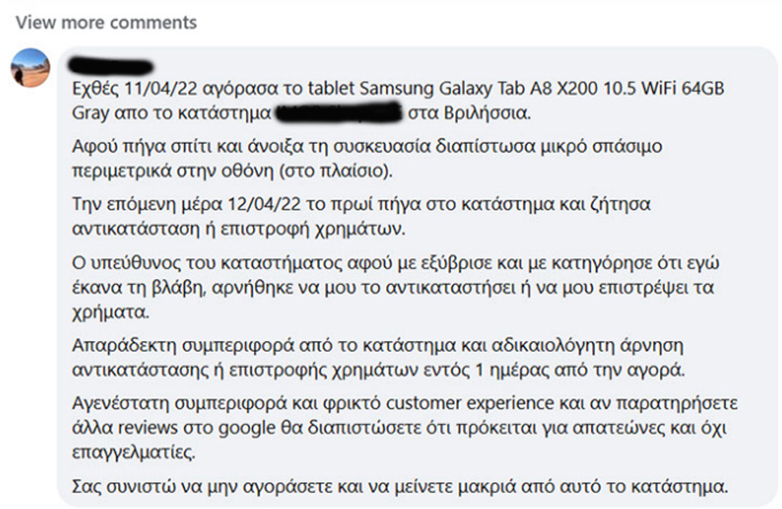 Και η καταγγέλλουσα συνεχίζει: «Η απόφαση του καταστήματος να μην επιστρέψει τα χρήματα είχε σοβαρές επαγγελματικές, οικονομικές και προσωπικές συνέπειες στη ζωή μου. Ως φωτογράφος, η έλλειψη του laptop έχει σταματήσει τη δουλειά μου. Έχω χάσει επαγγελματικές ευκαιρίες, προθεσμίες και οικονομικούς πόρους.